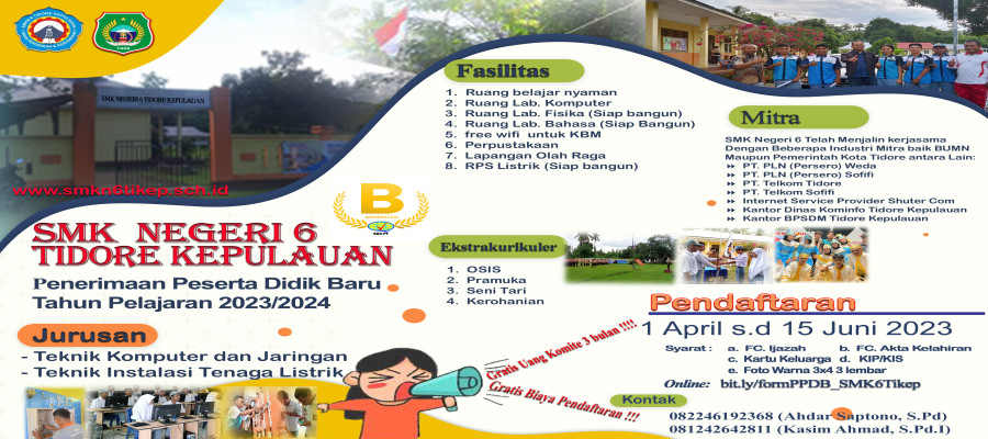Memasuki Tahun Pelajaran 2024/2025 SMK Negeri 6 Tidore Kepulauan akan membuka pendaftara calon peserta didik baru. Pendaftaran mulai dibuka tanggal 23